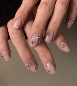 Речь идет о так называемом «голом» маникюре: прозрачное или едва заметное нюдовое покрытие на коротких ногтях естественной формы — мягкий квадрат или аккуратный овал. Основной акцент здесь совсем небольшой — миниатюрная страза, металлическая бусина или жемчужина. Именно эта деталь превращает простой маникюр в модный.
